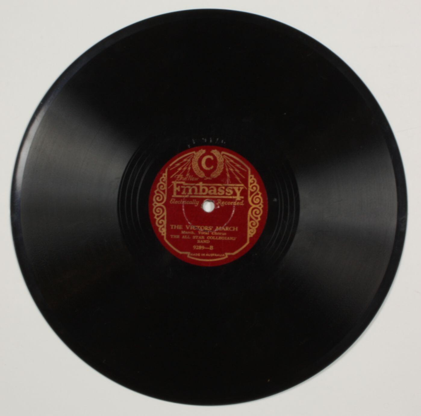 Embassy disc recording (10 in) double sided, "Betty Coed", by the Rah- Rah Boy's Band. "The Victors' March", by the All Star Collegians' Band.