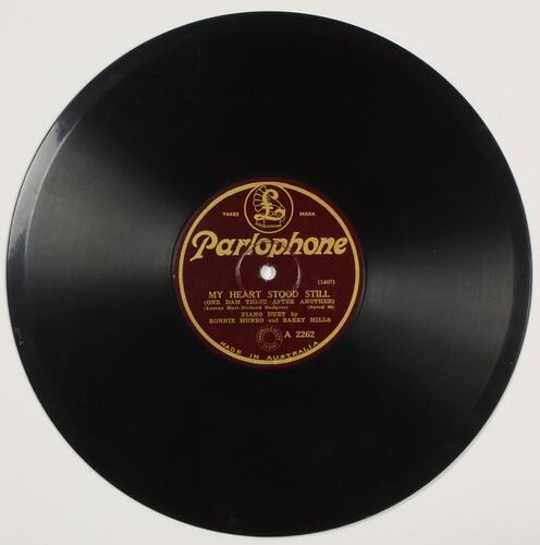 TYPE: PARLOPHONE 10 IN. CONTENTS: "THE BIRTH OF THE BLUES" AND "MY HEART STOOD STILL", PIANO DUET BY RONNIE MUNRO AND BARRY MILLS. COMPANY: MADE IN AUSTRALIA. TYPE DETAILS: DOUBLE SIDED. RED LABEL. 78 RPM. COMMENTS: CAT. NO. A2262. MATRIX NOS 1406- 2 AND 1407.