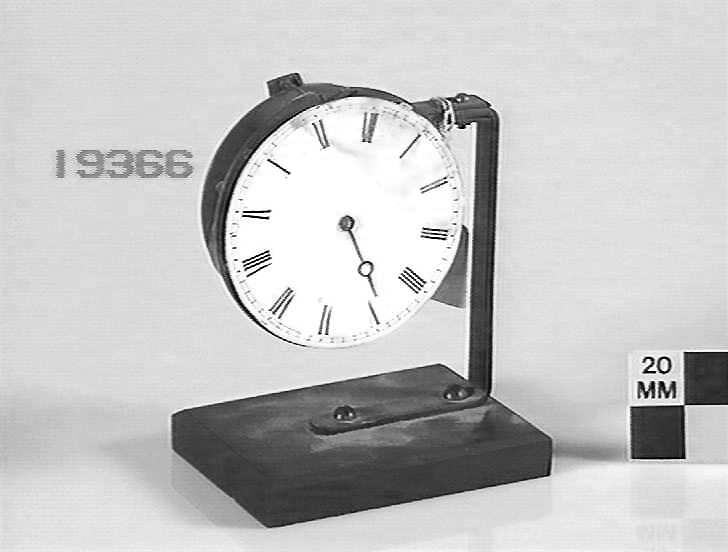 Mantel clock movement, mounted on a display stand, made in France, late 19th century.