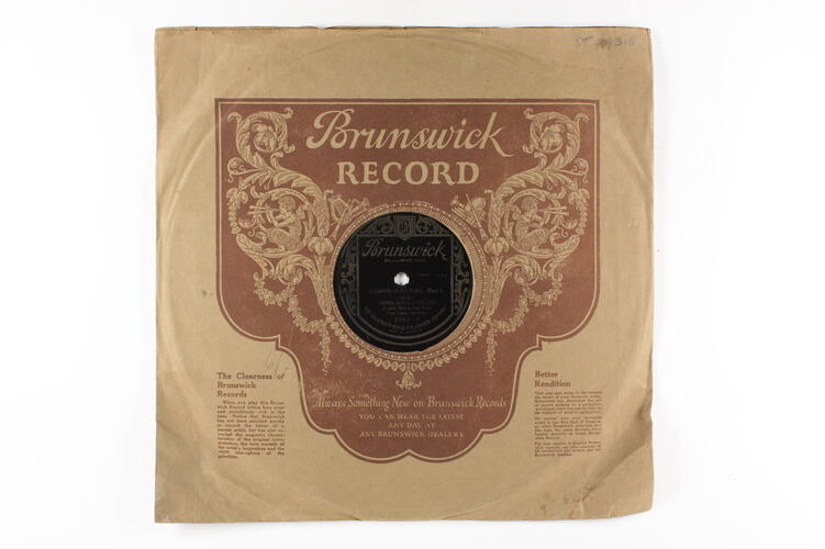 TYPE: BRUNSWICK 10 IN. CONTENTS: "OBERON OVERTURE" PART 1 AND 2, BY THE CAPITOL GRAND ORCHESTRA. COMPANY: TYPE DETAILS: DOUBLE SIDED, BLACK LABEL. CONCERT ORCHESTRA SERIES. COMMENTS: CAT. NOS. 20013A AND 20013B. MATRIX NOS. X10792 AND X10795.