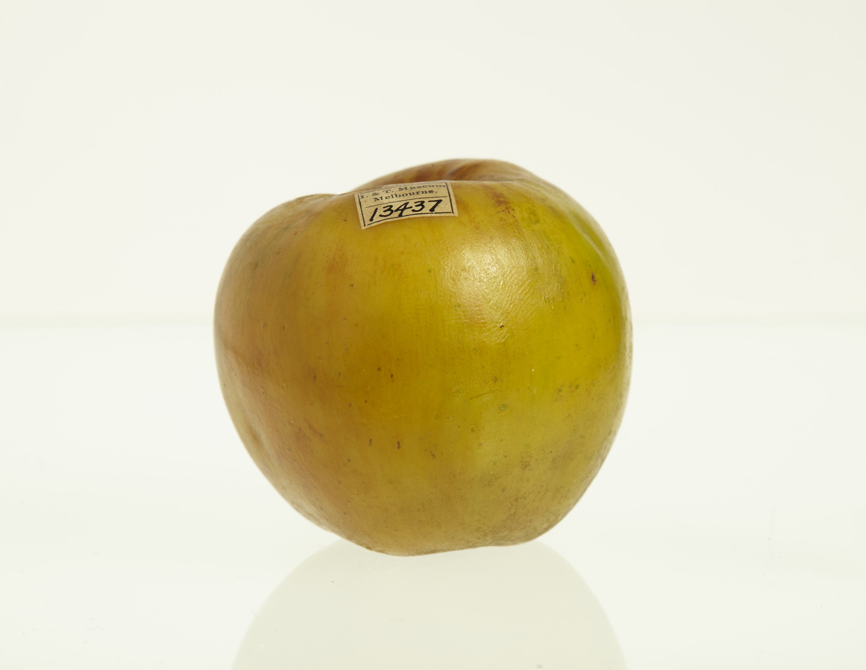 Wax model of an apple with short stem, painted yellow, brown and green.