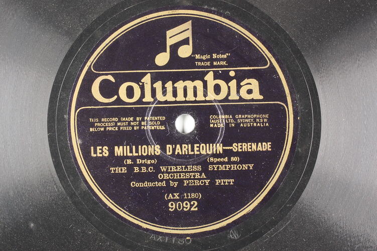 TYPE: COLUMBIA 12 IN. CONTENTS: "LES MILLIONS D'ARLEQUIN" AND "MINUET" BY THE B. B. C. WIRELESS SYMPHONY ORCHESTRA. COMPANY: COLUMBIA, AUSTRALIA. TYPE DETAILS: COMMENTS: CAT. NO. 9092. MATRIX NOS. AX1180 AND AX1181.