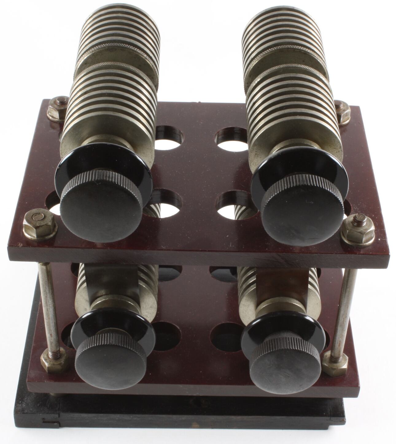 Dark brown wooden base supporting an assembly of two pairs of finned adjustable spark gaps, each pair mounted on an insulated plate; one pair above the other. The two plates are supported by four threaded rods.