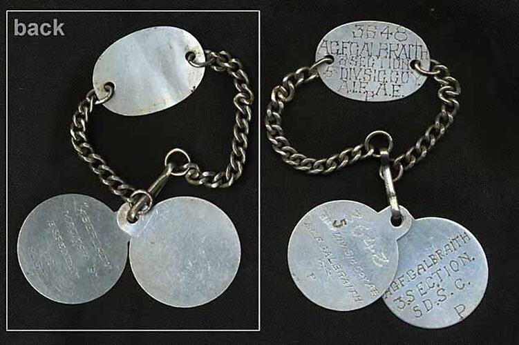 Engraved on identity bracelet tag: 3648/ A.G.F.GALBRAITH/ 3 SECTION/ 5TH DIV.SIG.COY./ A.I.F. A.E./ P Engraved on one identity disc - obverse: 3648/ 5 DIV SIG COY AE/ A.G.F. GALBRAITH/ P; reverse: "ABERLADY"/ MACKAY ST/ ESSENDON/ VIC./ AUST. Engraved on other identity disc - obverse: AGF. GALBRAITH/ 3. SECTION./ 5 D.S.C./ P