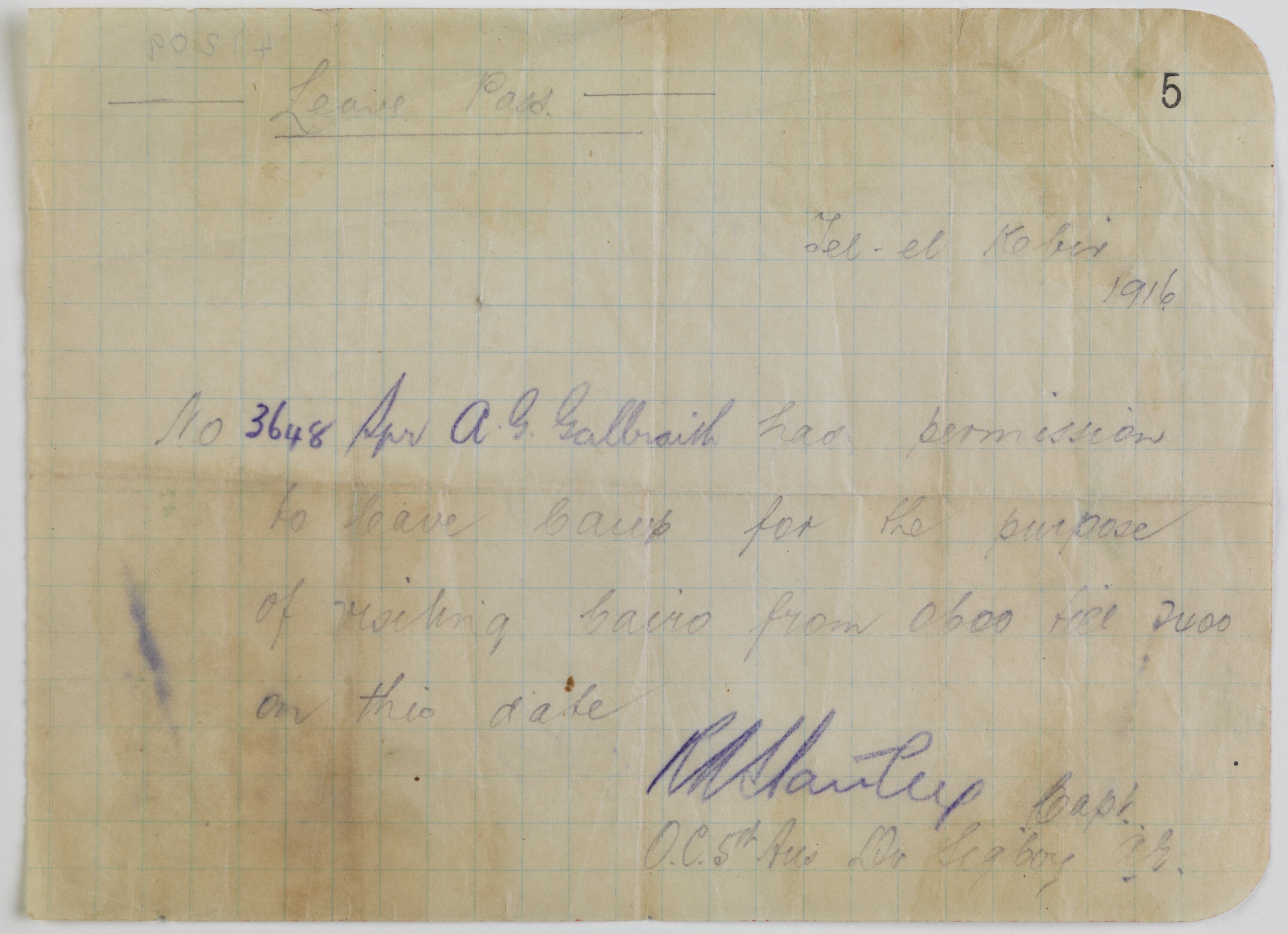 5/ Leave Pass/ Tel-el-Kibir/ 1916/ No 3648 Spr A.G Galbraith has permission/ to leave camp for the purpose/ of visiting Cairo from 0600 to 2400/ on this date/ (?) Capt./ O.C. 5th Aus Div Sig Coy (?)