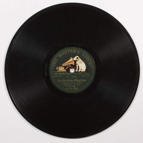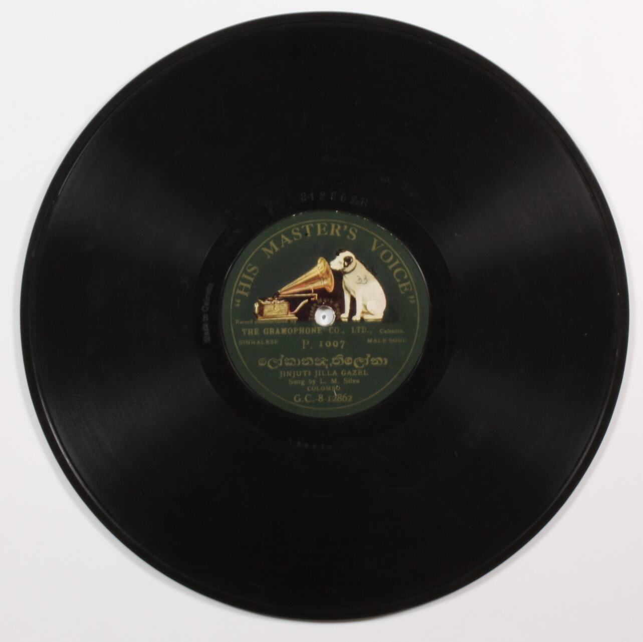 Side A: GRAMOPHONE CONCERT RECORD / (logo) HMV / Manufactured by The Gramophone Co., Ltd./ SINHALESE / DUETT / (Sinhalese script) / MAAD DADARA Sung by L. M. / Silva and Andrew Perera / COLUMBO / G.C-8-14048 Side A (run-out): 126860 / 8-14048=M Side B: HIS MASTER'S VOICE / (logo) HMV / Record manufactured by / THE GRAMOPONE CO., LTD Calcutta / SINHALESE / P. 1007 / MALE SONG / (Sinhalese script) / JINJUTI JILLA GAZEL / Sung by L. M. Silva / COLUMBO / G.C-8-12862 Side B (run-out): 126930 / 8-12862=R / Made in Calcutta Paper slip: Sinhalese / pre-1920