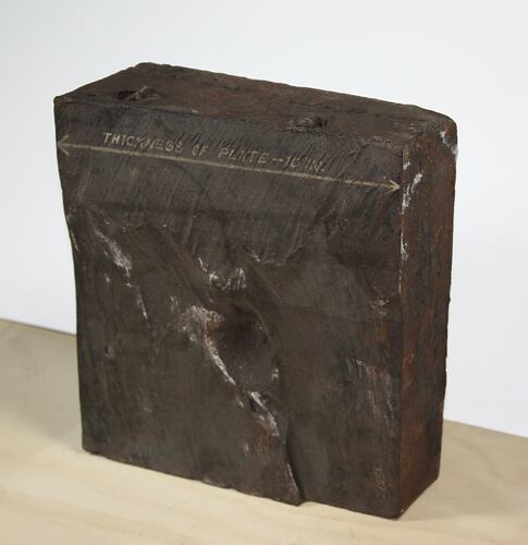 Sample of the wrought iron armour plate from the aft turret (one of two turrets) of the HMAS Cerberus warship, cut using oxyacetylene equipment. This sample is a section cut from a larger test block that was cut to estimate how much gas would be required for cutting up the vessel. The roughness of the cut in this sample is due to the poor quality of the air.