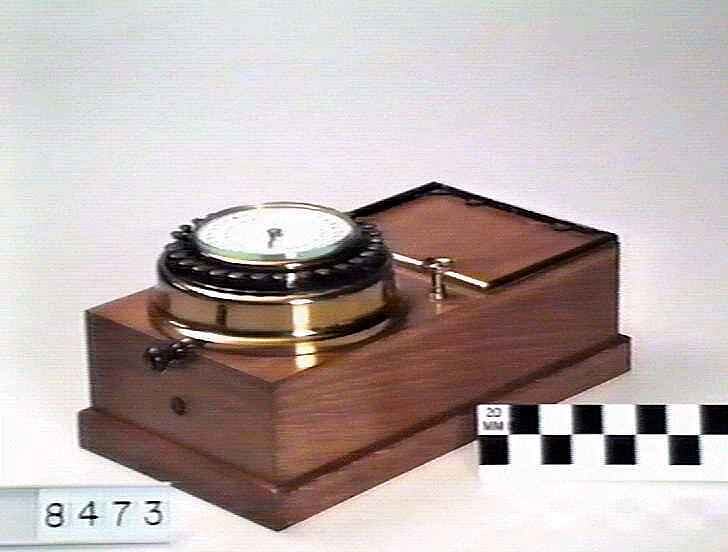 Circular instrument with a brass case and a white dial. Dial is marked with the letters of the alphabet and an apostrophe, semicolon, full stop and '+' around its periphery. Inside the ring of letters is a ring of numbers 1 through to 0 and a '+'. A pointer pivoted in the centre of the dial can move to indicate a particular letter or number. The pointer is mounted on a wire coil which can rotate between the poles of a magnet mounted on the back of the instrument. Outside the periphery of the instrument and opposite each letter is a small circular brass key which can be depressed as required. The instrument is mounted on a hollow wooden rectangular base with the dial horizontal. A crank handle projects from the front of the case, below the instrument. The handle is connected to another moving coil moving between the poles of a set of magnets.