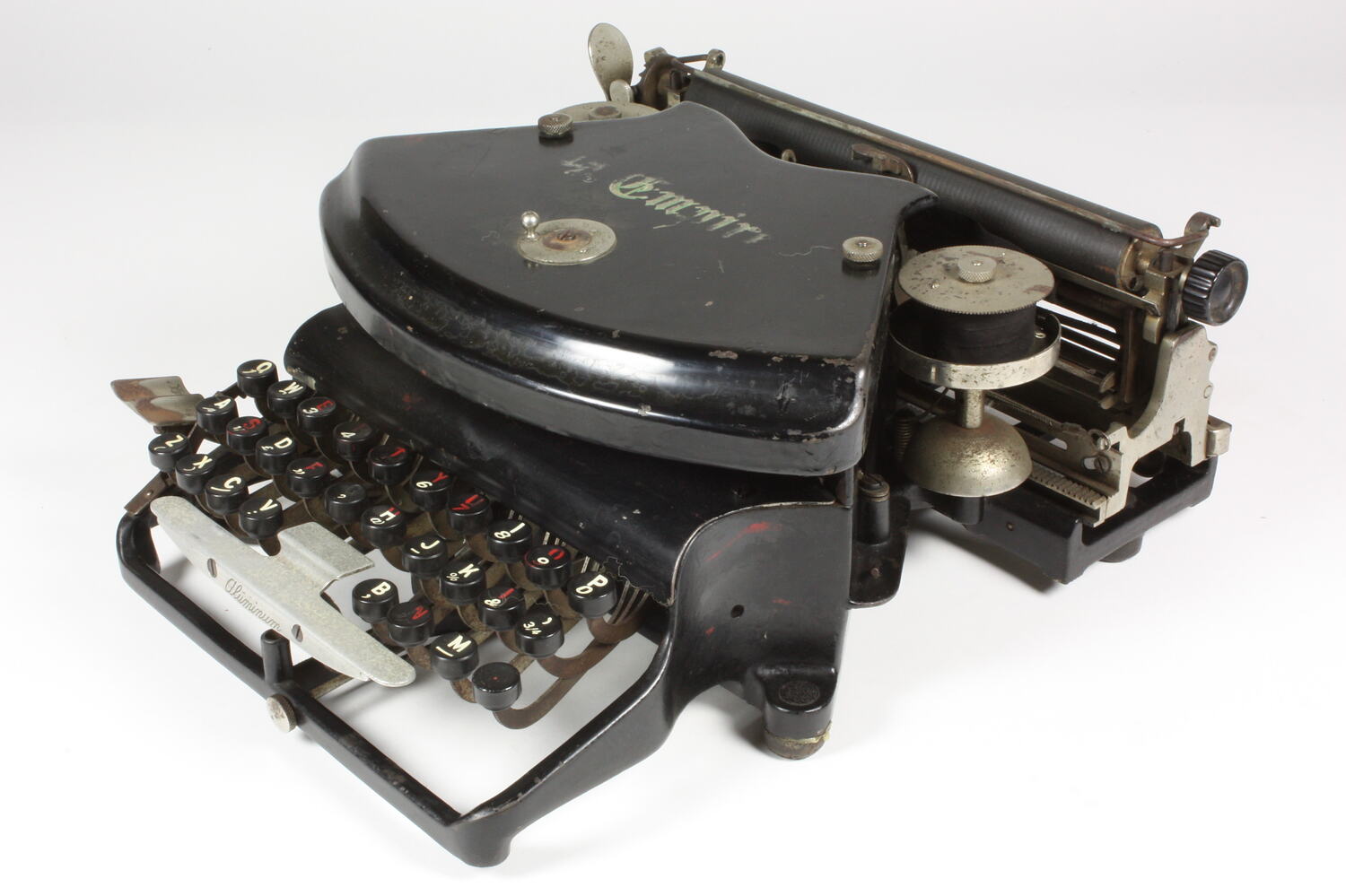 In gold lettering on fan-shaped cover: 'Empire' Engraved on top of shift key: 'PATENTED / CANADA JULY 22 1892 / GREAT BRITAIN MAR 29 1892 / VICTORIA JUNE 2 1892 / NEW SO [sic] WALES JUNE 11 1892' On front of shift key: 'Aluminium' Serial number engraved at back of lower frame member: '15121'