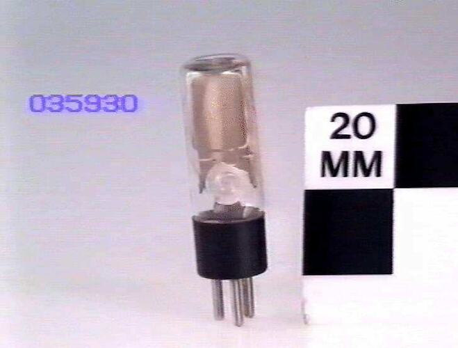 Tubular glass bulbs on three pin miniature bakelite base. Each with curved cathode with gold coloured internal surface. Valves are contained in rectangular buff coloured cardboard boxes.
