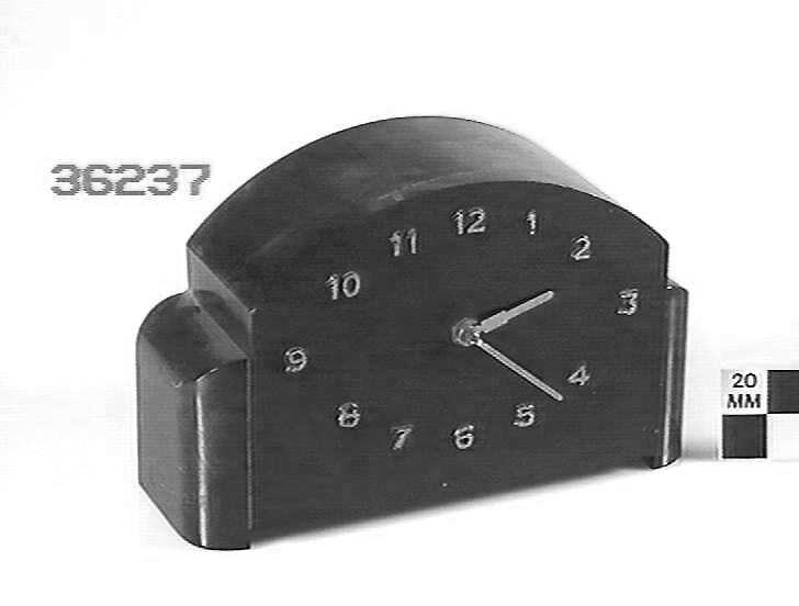 Clock in brown plastic case with raised numerals as dial. Electric impulse movement. Powered by 4.5 volt battery in base.