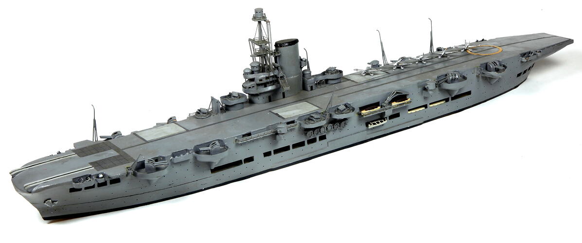 Model of the Royal Navy aircraft carrier (22,000 tons) HMS Ark Royal. Built by Cammell Laird & Co., Birkenhead and launched in 1937, Ark Royal incorporated all the improvements in design of Royal Navy aircraft carriers since the First World War with an island superstructure, double hangar decks for a maximum of 72 aircraft, improved anti-aircraft armament, steam catapults and more speed. After commissioning in 1938, Ark Royal served with the Home fleet and soon after the outbreak of World War II in September 1939 took part in an action against two U-boats resulting in the sinking of one (U-39). Later in 1939, Ark Royal joined the hunt for the German pocket battleship Admiral Graf Spee in the South Atlantic but did not take part in the action leading to the scuttling of the Graf Spee off Montevideo. From April to June 1940 Ark Royal operated off Norway with her aircraft carrying out escort and strike operations against Geman land and sea targets. Ark Royal joined the Mediterannean fleet in late 1940 and served as part of Force H operating in the Atlantic and Mediterranean against the Italian fleet and covering convoys to Malta. In May 1941, Swordfish torpedo bombers from Ark Royal crippled the German battleship Bismarck leading to the destruction of the ship by surface units.