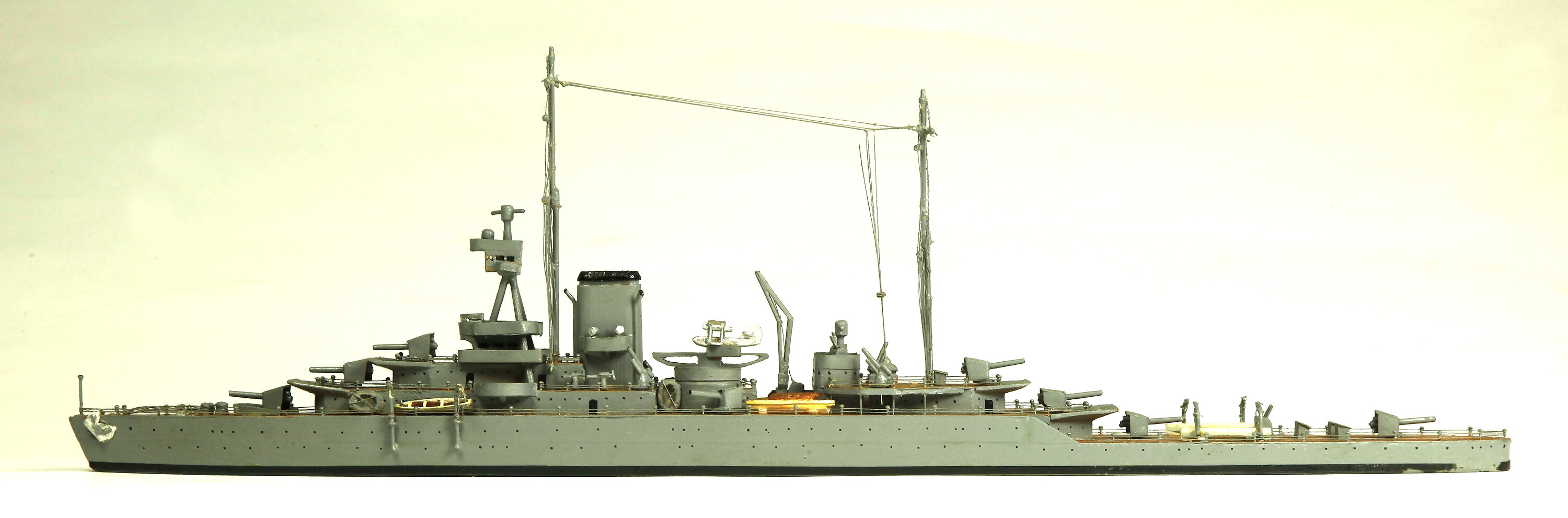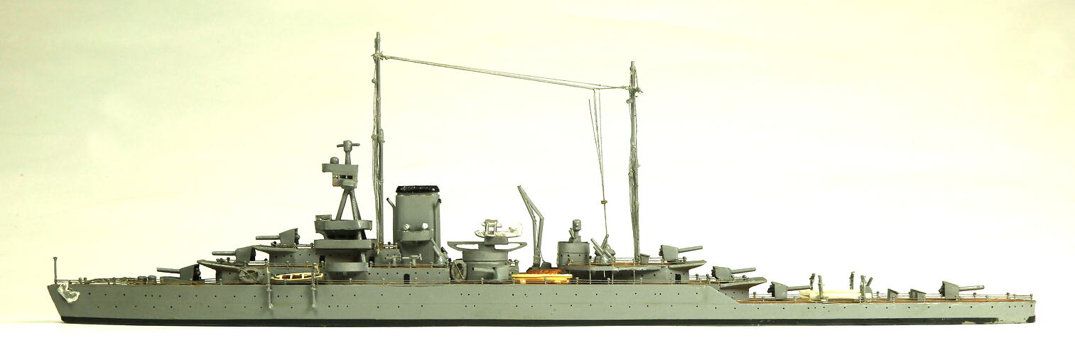 Model of the Royal Navy Improved Birmingham class heavy cruiser HMS Effingham commissioned in 1925 (9550 tons). This model shows the ship following extensive modification in 1937-38. HMS Effingham was lost during the Norwegian Campaign after colliding with a rock on 18 May 1940 near Bodo. This model was acquired from the model-maker Mr E.J. Krummeck in 1941 as one of a large collection of naval ship models. Krummeck was a member of the Victorian Model Shipbuilding Society.