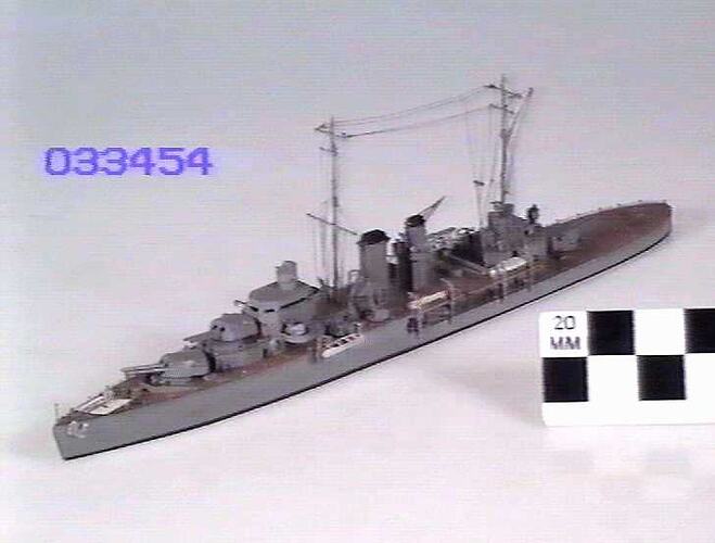 This model was made by E.J. Krummeck of Melbourne and was purchased by the Museum in 1941. It is part of a collection of British and Australian naval ship models purchased from Krummeck.