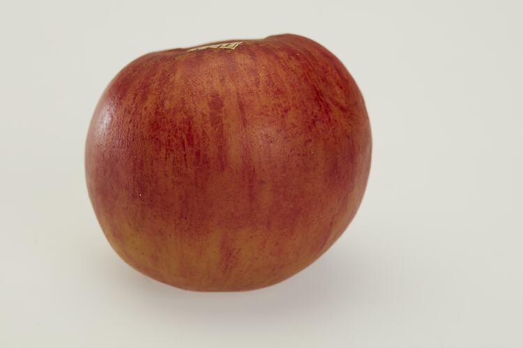 Wax model of an apple with short stem, painted red-orange with red stripes. Possible plaster interior.