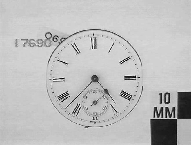 White enamel dial has black roman numerals and seconds dial at 6.