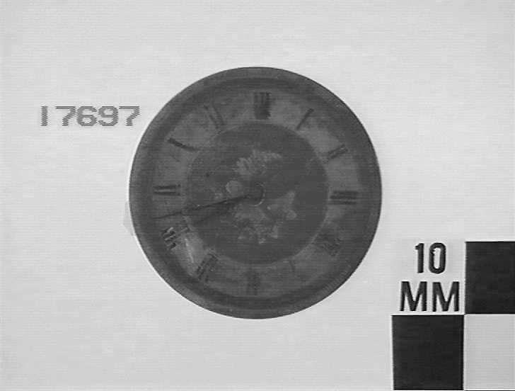 Ornamental metal dial has black roman numerals. Key wound spring; lever escapement. Scale fast to slow.