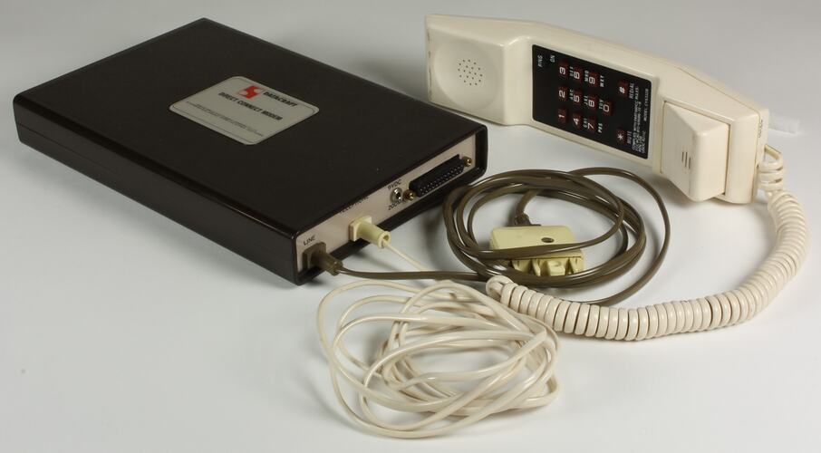 Datacraft model 5003M direct connect modem, with Dick Smith 'Pal- Phone' model F-5188 telephone handset. For use with terminals remote from main computer, using 300 bits per second data rate communication (V.21). Used by staff at Latrobe University to remain in contact with mainframe while working at home - an early example of telecommuting. With instruction booklets, 2 examples. Made by Datacraft in Australia and by Dick Smith, probably in Hong Kong in 1985.