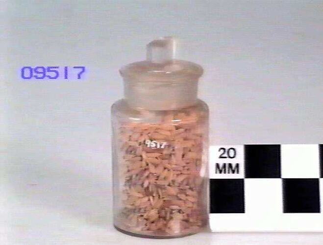 Glass jar with stopper containing rice sample.