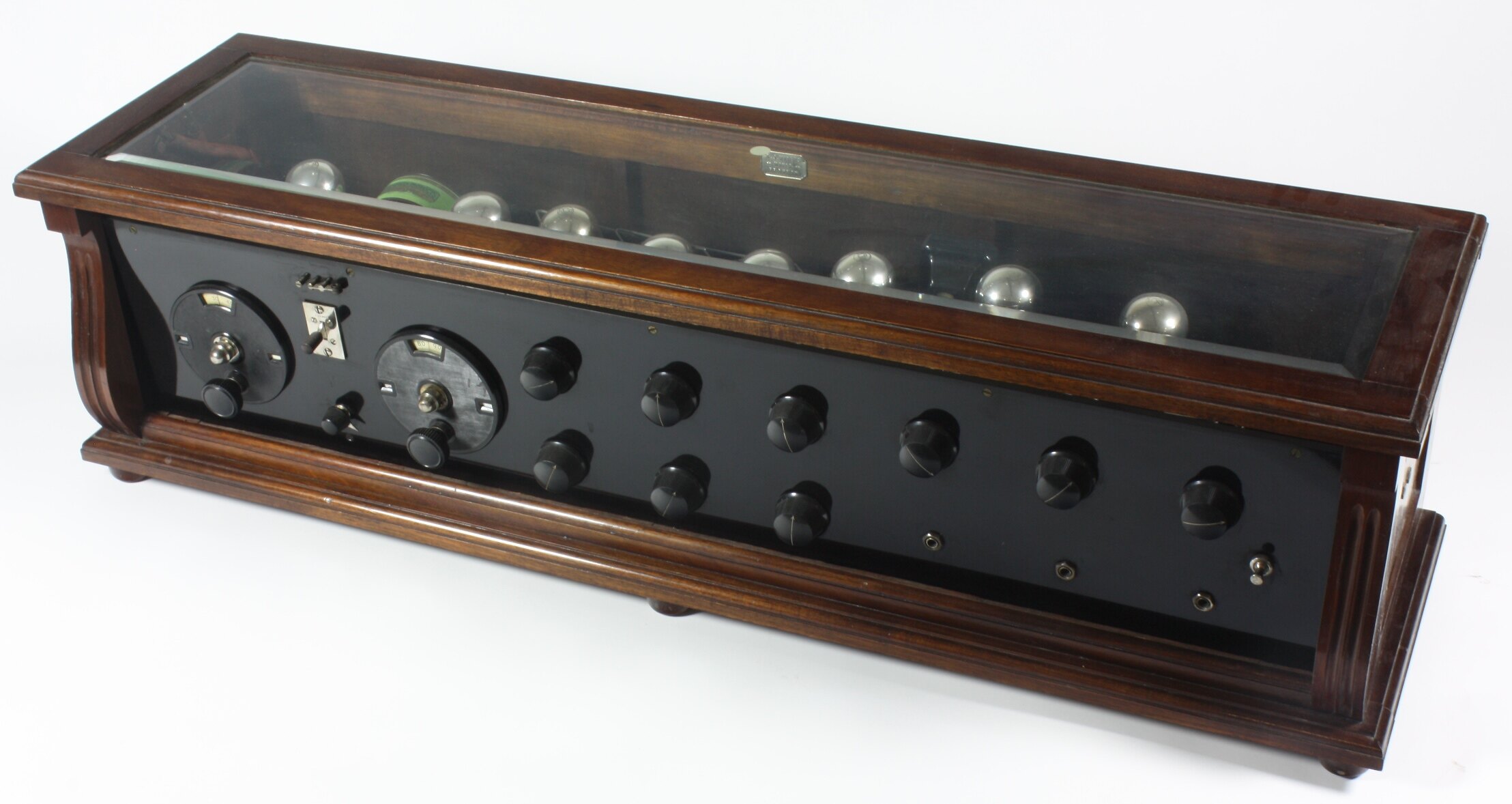 Long wooden cabinet with bevelled glass window in its lift-up lid. The front panel has two tuning dials, one small trimmer, 9 rheostats, a key switch, a small knife switch, a push-pull switch and three phone jacks.