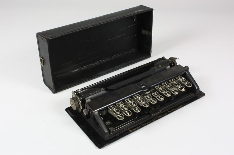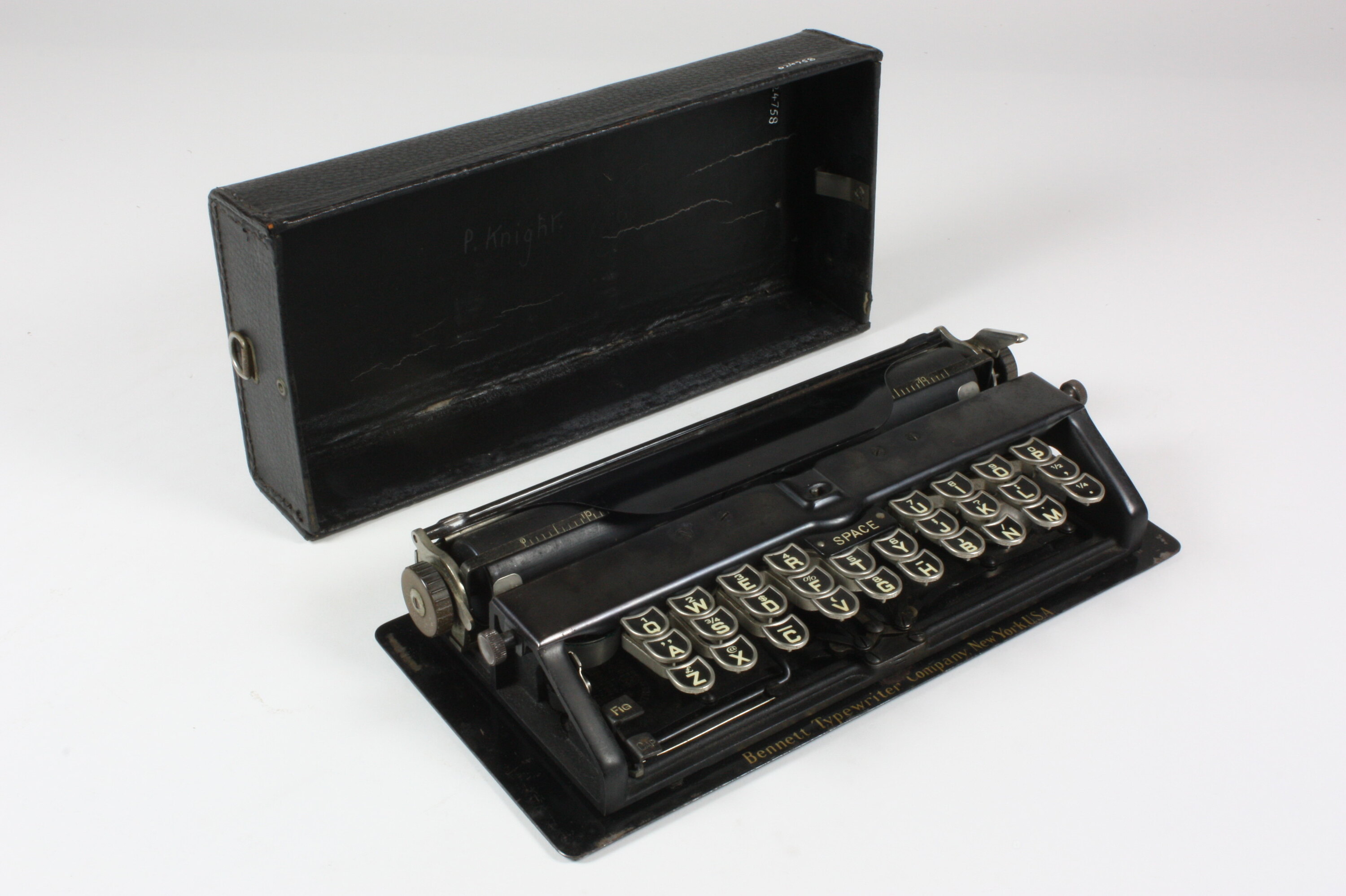 Typewriter of the type-wheel class, manufactured by the Bennett Typewriter Company of New York, U.S.A. The design of this machine was first patented in 1901 by Charles Bennett of New Jersey. Subsequent developments were the subjects of further patents and the most recent patent listed on this particular example is dated 26 May 1908.