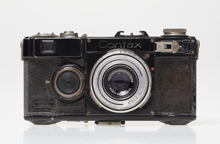 Body: 'Contax' 'ZEISS / IKON'. Around lens: 'Carl Zeiss Jena Nr. 3065579 Tessar 1:3,5 f=5cm T '.