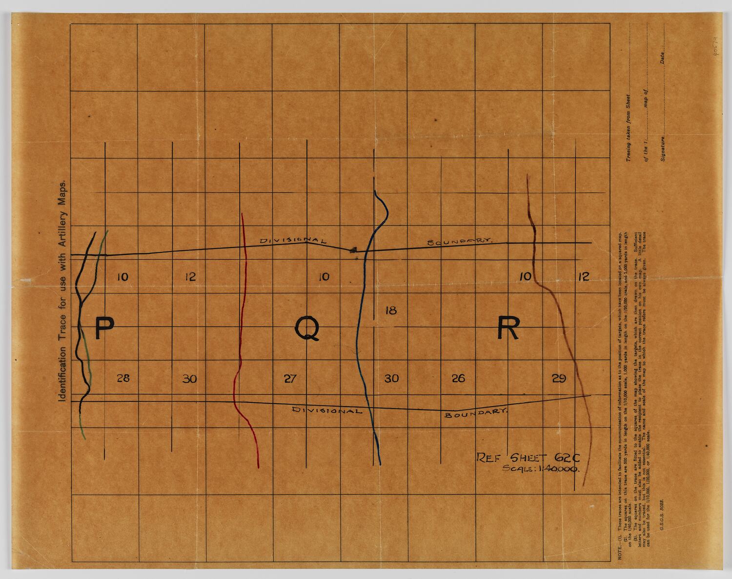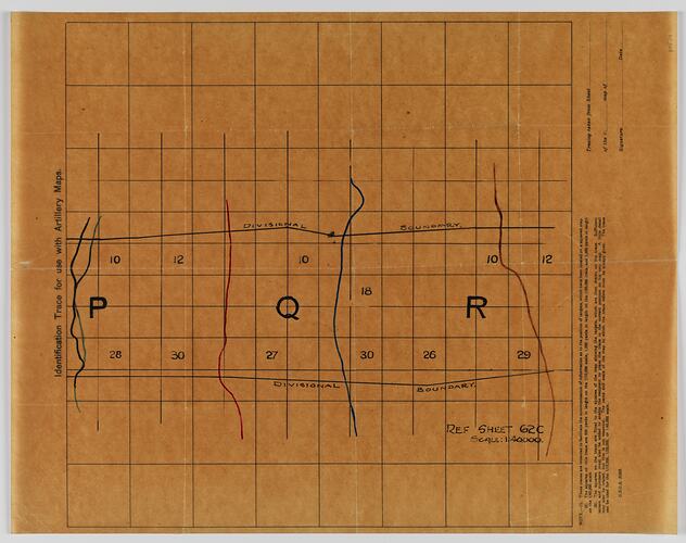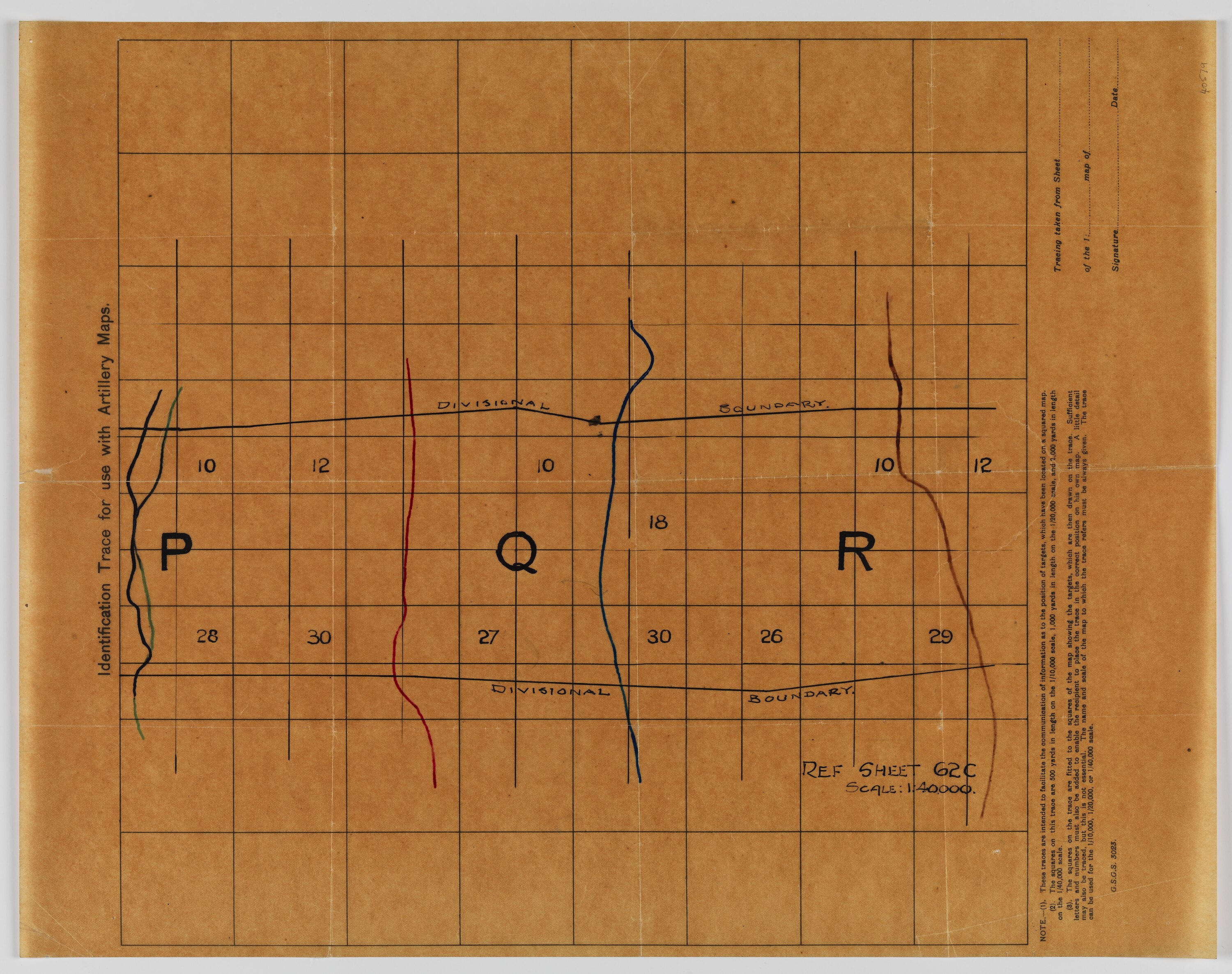 'Identification Trace for use with Artillery Maps. Ref Sheet 62c Scale: 1:40000. Map showing Divisional Boundaries, divided into three sections ( P, Q, R) also numbers shown (28, 30, 27, 26, 29, 10, 12, 18)' These traces are intended to facilitate the communication of information as to the position of targets which have been located on a square map...' G.S.G.S. 3023