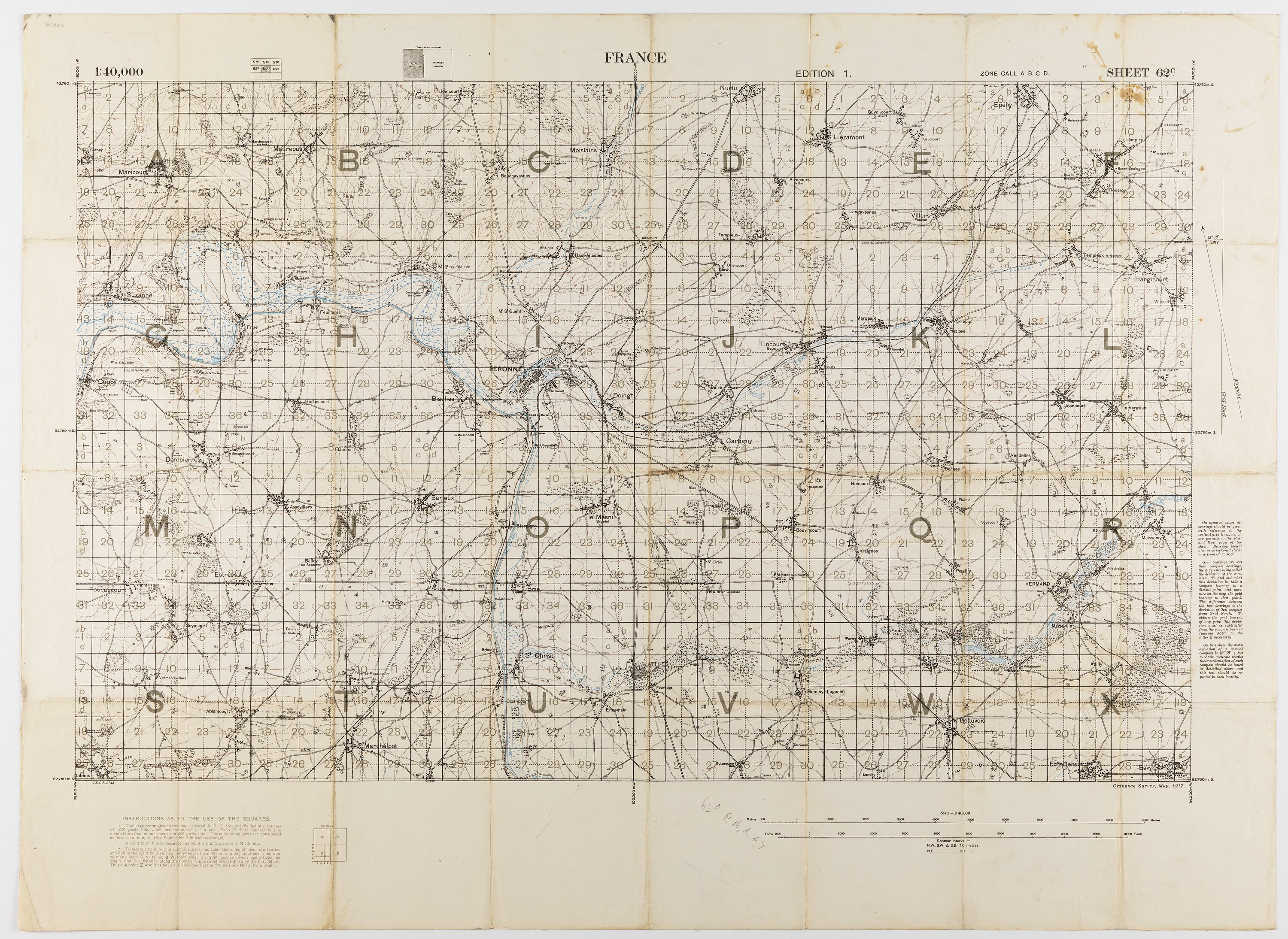 On cover surface (when folded) 'FRANCE. / SHEET 62c / EDITION 1. / INDEX TO ADJOINING SHEETS / SCALE 1/40,000 / ZONE CALL A. B. C. D.' Faintly written on front in blue pencil: 'Cpl Ea...' and [twice] 'P1'. Extensive text across map. Lower left: 'G.S.G.S. 2743'.