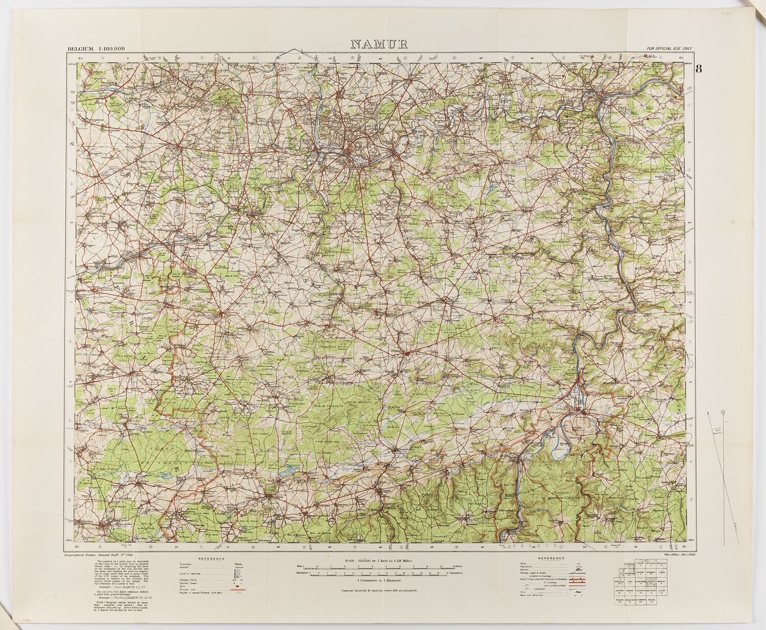 Printed on front: 'BELGIUM 1:100,000 / NAUMR / FOR OFFICIAL USE ONLY / Geographical Section, General Staff, No. 2364 / War Office, Dec., 1910'. Extensive text follows. Hand-written on reverse: 'NAMUR 8'.