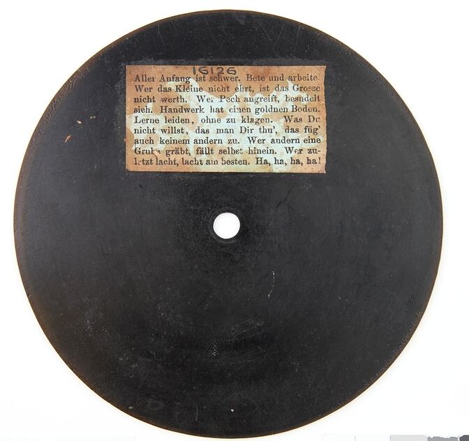 Playing side: E. BERLINER'S / GRAMMOPHON / D. R. P. 45048/ 2 / No R 443 / Alle Copir Rechte / vorbehalten / Ipruihe (hand engraved) Non-playing side on paper sticker: Aller Anfang ist Schwer. Bete und arbeite. Wer das Kleine nicht ehirt, ist das Grosse nicht werth. Wer Pach angreift, besndelt sich. Handwerk hat einen goldnen Boden. Lerne leiden, ohne zu klagen. Was De nicht willet, das man Dir thru', das fug' auch kleinem andern zu. Wer andern eine Grube(?) grabt, faut selbet hinein. Wor zu-l(?)tzt, lacht ain besten. Ha, ha, ha, ha!