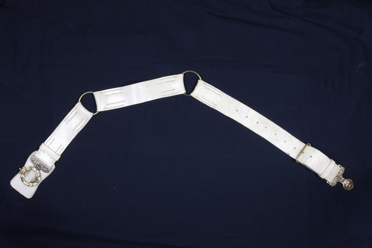 Ivory leather waist belt, 4cm wide. Brass buckle adjuster on right hand side; two brass rings on either side back. Ornate buckle at centre front embellished on circle surround with laurel leaves rising from the base and a crown at the centre top; elaborate scroll design at point where buckle attaches to belt. Tongue of the buckle has '40' in the centre. Buckle is gilded. Behind the buckle is a thick protective tab of leather stamped on the back with two arrow heads. Belt loop on left hand side. Sword slings and hook missing.