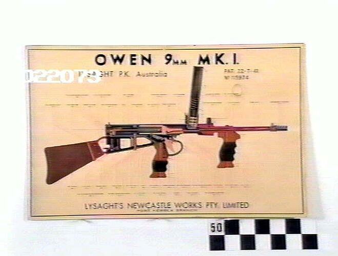 Full colour print of an instructional drawing of a sectioned Owen MkI sub-machine gun with named parts. Design patented 22 July 1941. Published by Lysaght Newcastle Works Pty Ltd, Port Kembla Branch.