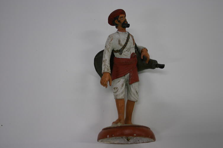 Figure of a man on a round base made from fired clay, painted brown. A paper label is glued to the upper side of the base. The figure is fired clay modeled over ferrous metal armature, which attaches to the base. The figure is painted, with a terracotta skin tone and is wearing a white shirt and pants, with a red hat and sash; he is carrying a water bag over his left shoulder.