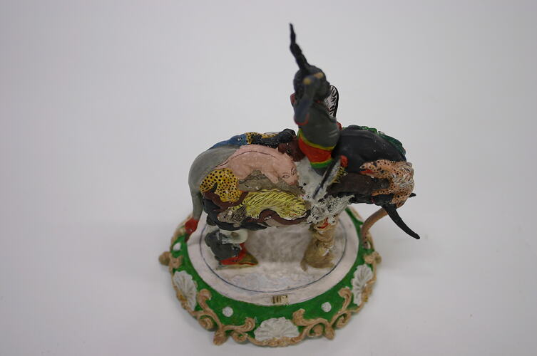 Figure of a diety sitting on a mythical elephant whose body is composed of other animals. The figure is on an oval base and both figure and base are fired clay with a painted green, white and gold surface, modelled over ferrous metal armature. A paper label is glued to the upper surface of the base.