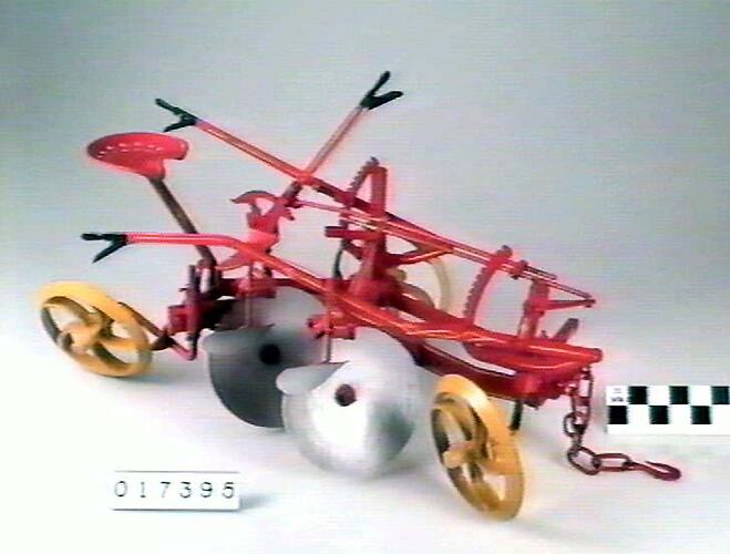 Model of two furrow "Sunray" disc plough, manufactured by H.V. McKay Pty. Ltd., Sunshine, Victoria, Australia, about 1928. Model made by H.V. McKay, Sunshine, Victoria.