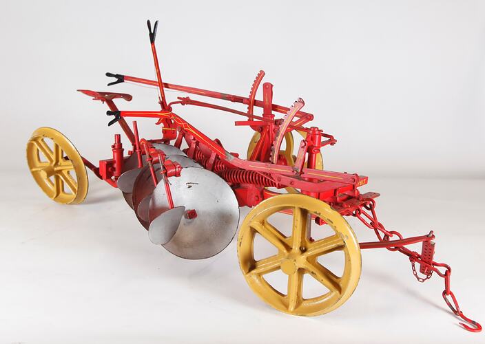 Model of a 'Sunrise' three-furrow stump jump disc plough. Model made by H.V. McKay, Sunshine, Victoria, before 1915.
