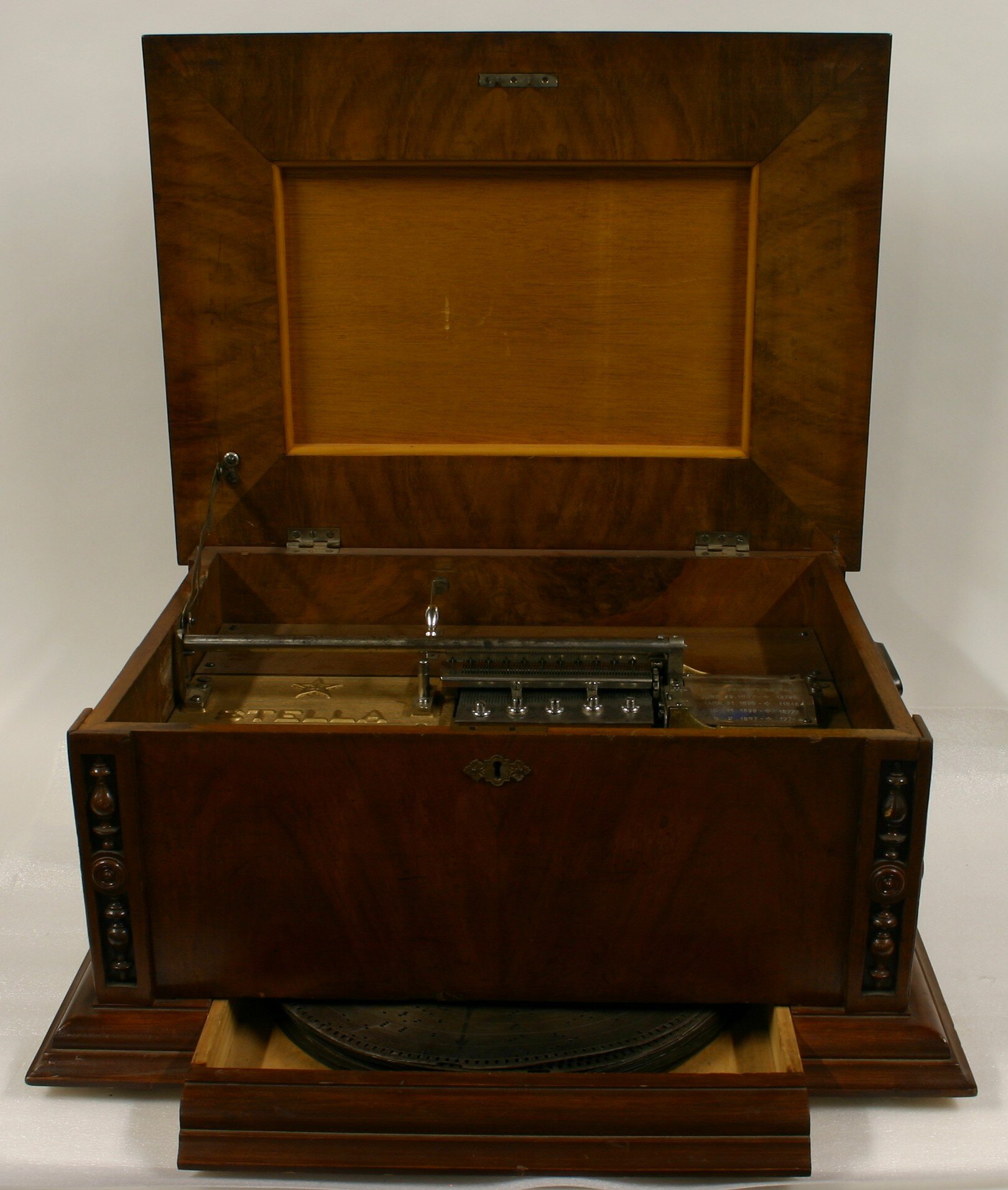 Stella brand mechanical music machine with 30 discs made by Mermod Freres in Sainte-Croix, Switzerland in 1885. This particular machine is Swiss made with a British patent (patent dates range from 22nd September 1885 to 29 June 1897) it is possible the mechanism was made in Switzerland and the box was made in the United Kingdom. Stella music boxes used a star wheels moved by the holes in the smooth disc and not by protrusions of metal, making the discs less fragile and easier to store.