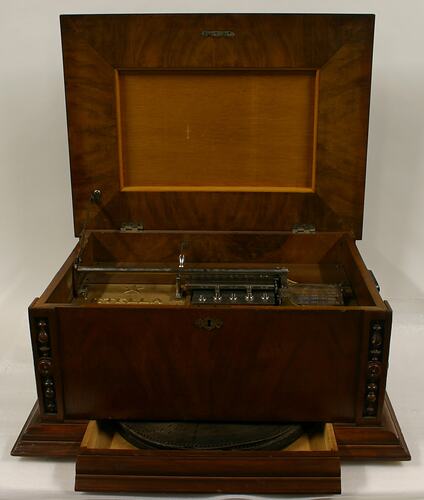 Wooden box with winding handle at right end. Levers stop play and moderator fast/slow. It has 30 discs of 35.5cm stored in a drawer in the base.