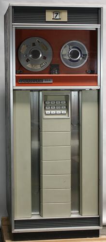 Cabinet with grey side panels. Two full height grey doors on back. Upper front of cabinet has two tape spindles complete with reels and tape behind vertical sliding glass window. Control panel below window has 12 rectangular push buttons. Rotatable display above window can show numerals 1 to 7 or the words 'STAND BY'.