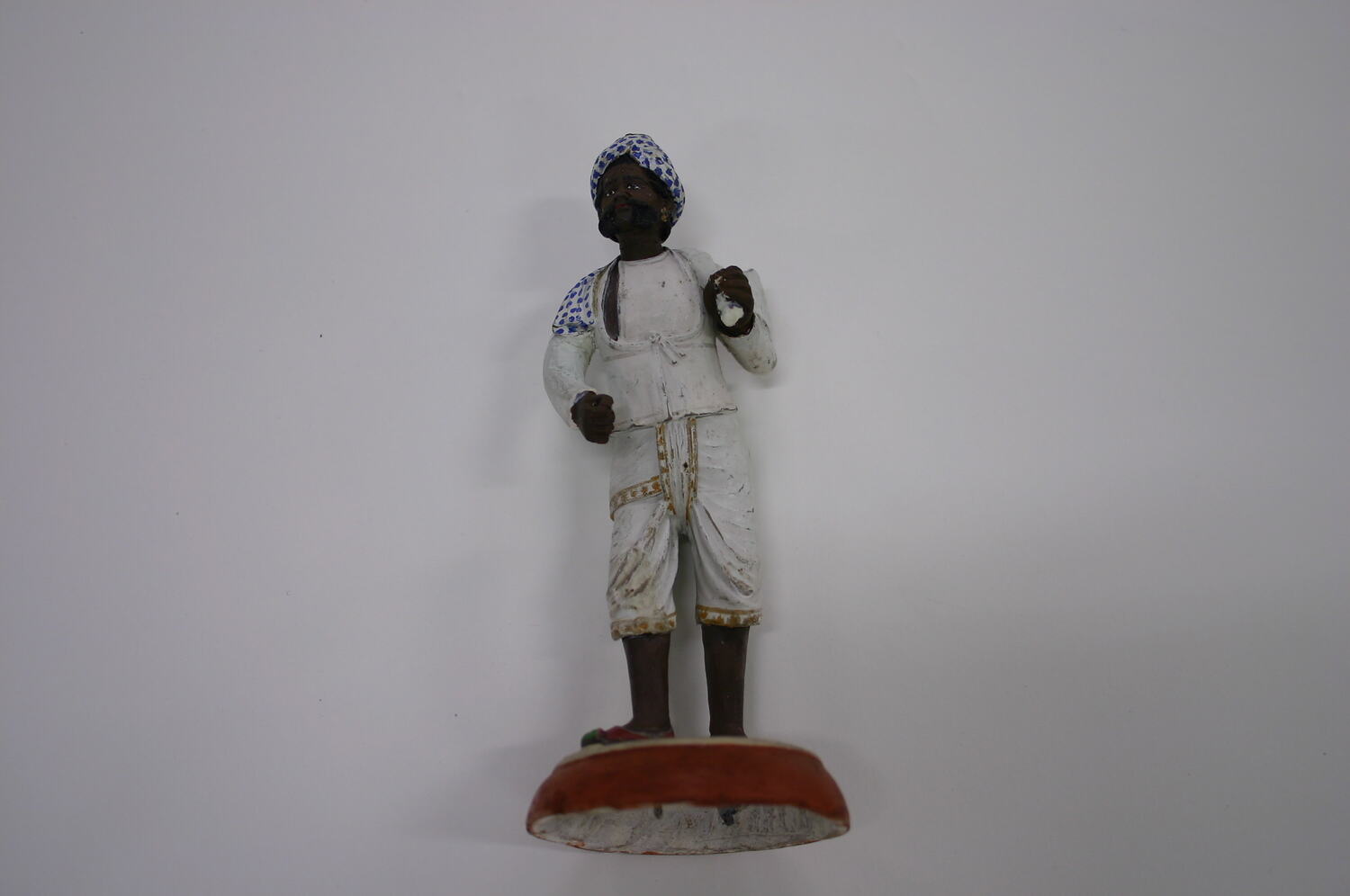Figure of a man on a round base made from fired clay painted brown. A paper label is glued to the upper side of the base. The man is fired clay modeled over ferrous metal armature, which attaches to the base. The figure is painted with a dark-brown skin tone and is wearing a white shirt and pants with gold trim, a blue and white turban and red shoes. He is holding something in his left hand, which appears to have once been slung over his shoulder - although this has been lost.