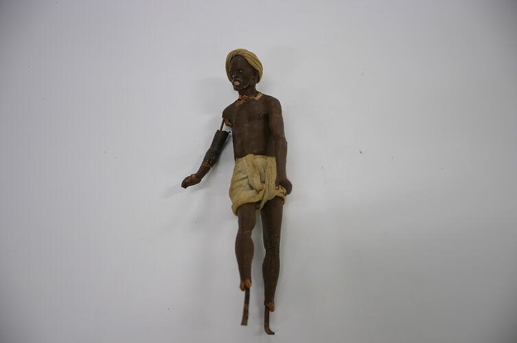 Figure of a man made from fired clay. The man is fired clay modeled over ferrous metal armature, and appears to have once been attached to a base. The figure is painted with a dark brown skin tone and is dressed in fabric. He is wearing a turban and white loin-cloth.