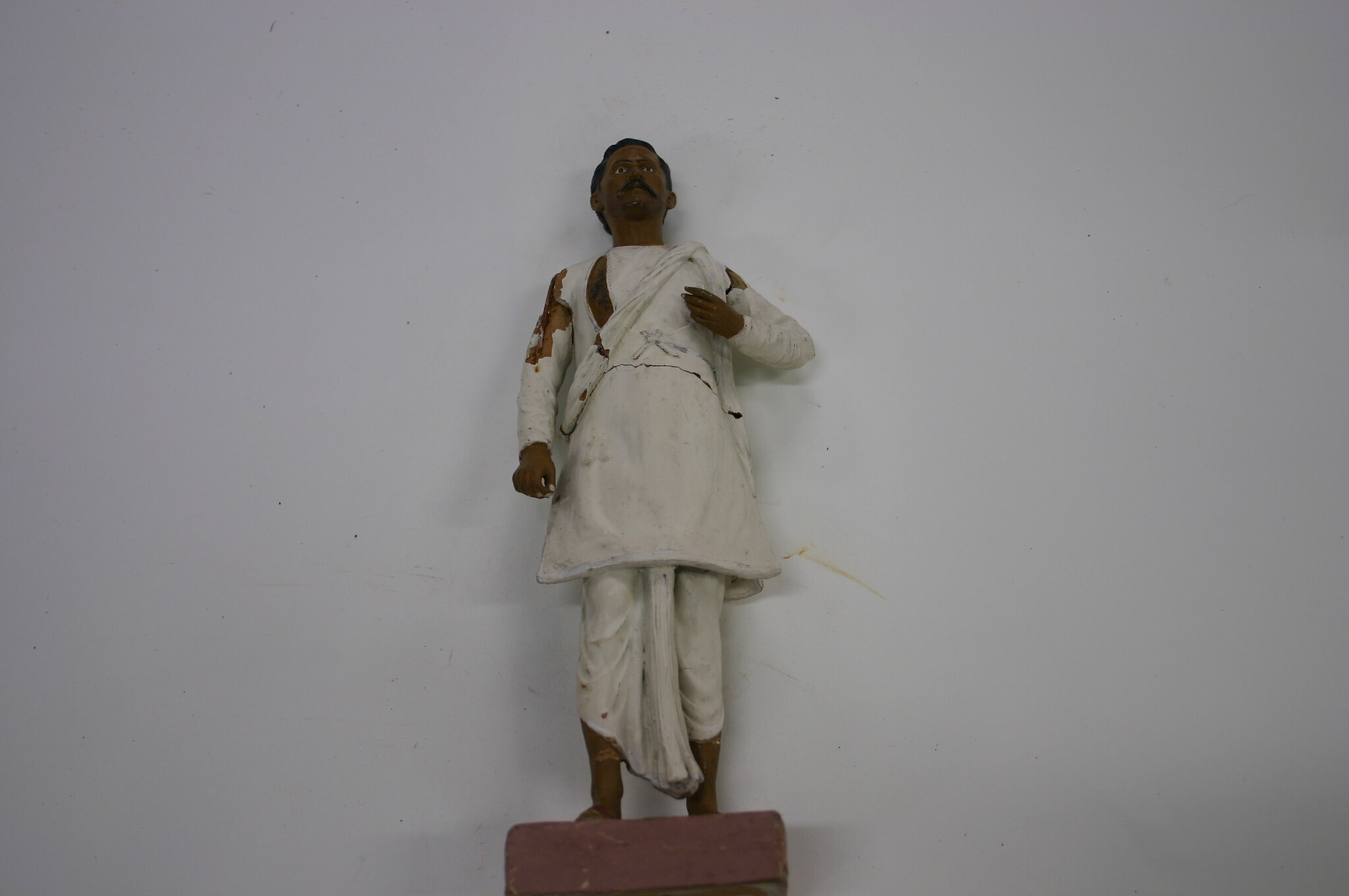 Figure of a man on a square base made from fired clay, painted brown. A paper label is glued to the base. The man is fired clay modeled over ferrous metal armature, which attaches to the base. The figure is painted with a brown skin tone and is wearing a white tunic and white pants; he has a white bag slung over his right shoulder.