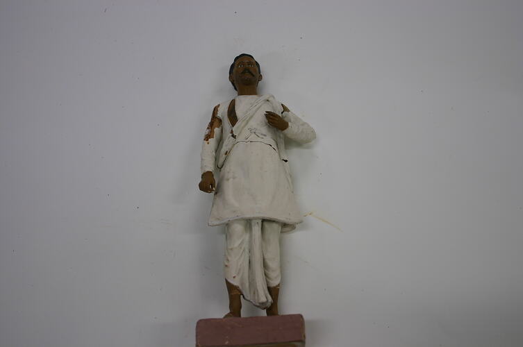 This clay figure of a Hindu Clerk was made in Lucknow, India. It was exhibited at the Melbourne International Exhibition in 1880, as part of a group of figures representing various castes, occupations and religious sects in India. This group was awarded a Third Order of Merit and was exhibited as part of the British India Court. It was gifted to the National Gallery of Victoria (NGV) by the India Commission of the Melbourne International Exhibition, 1880-81. The NGV Stock book identifies the figure as a 'Hindoo Clerk'.