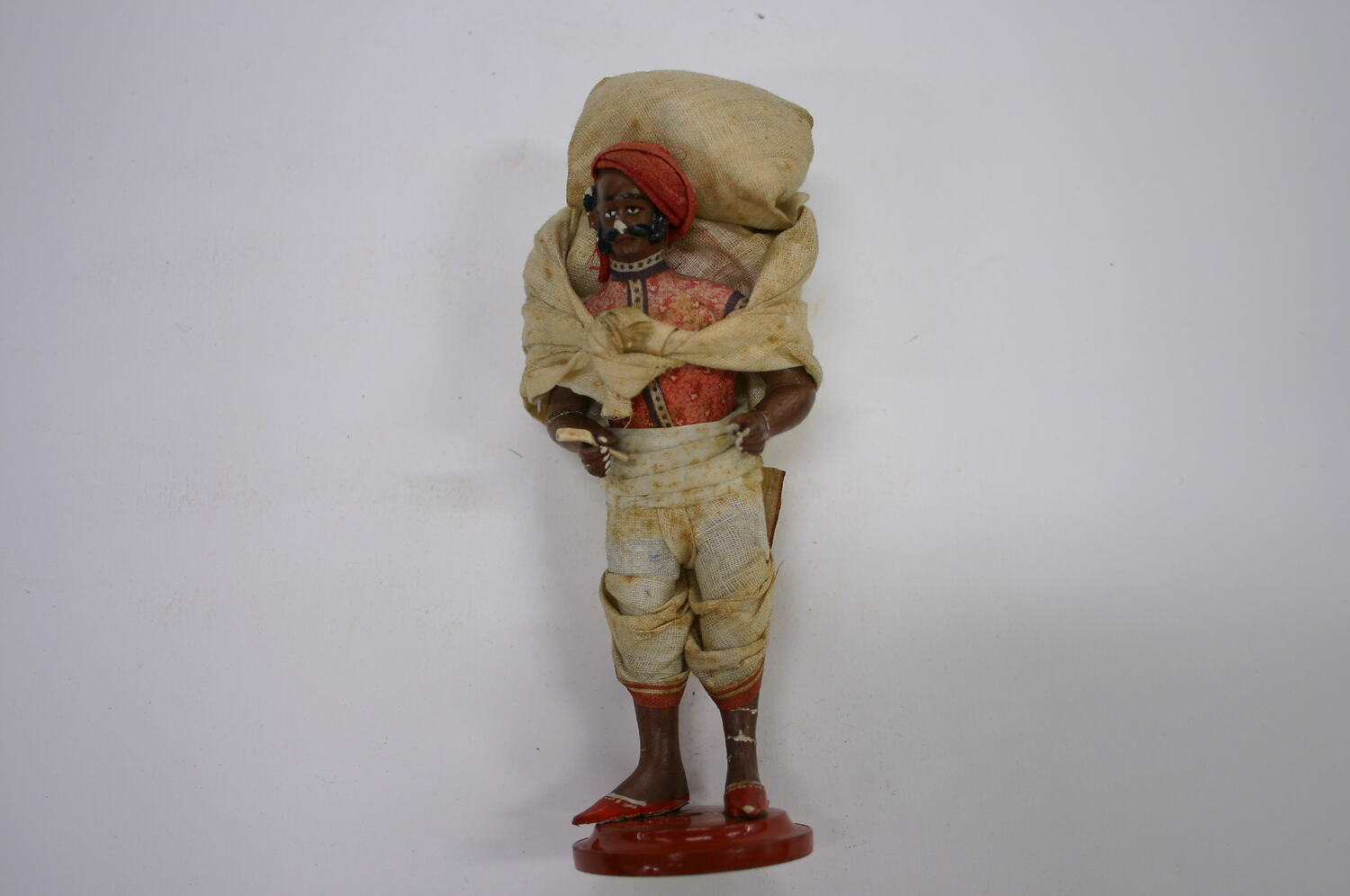 Figure of a man on a wooden base. The base is painted red, turned wood. The figure is plaster/composition modeled over wooden dowels, it is painted and dressed in fabric. He has a dark brown skin tone. His garments consist of a red cloth turban, a shirt of red and white cotton, a white sash and white trousers. He has painted red shoes and has two large cloth bundles slung across his shoulders. He is also holding a piece of folded paper in his right hand.