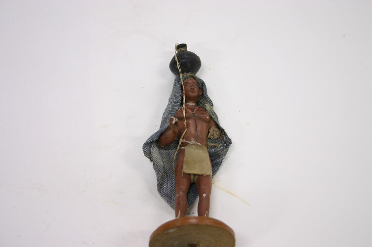 Figure of a man on a turned wooden base, painted brown. The figure is plaster/composition modeled over wooden dowels, it is painted with a dark brown skin tone and is dressed in fabric. His garments consist of a red yarn necklace, a blue and white wrap and a brown loincloth. The figure is carrying a pot on his head.