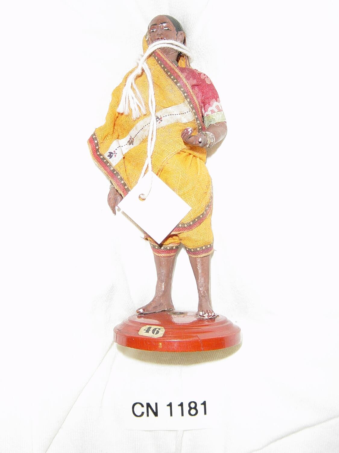 Figure of a woman on a wooden base. The base is painted red turned wood painted red. A paper label is glued to the upper surface of the base. The figure is plaster/composition modeled over wooden dowels, it is painted with a dark brown skin tone and dressed in fabric. She is dressed in a cotton red, pink and white shirt, orange sari with decorative strips of white red and black cotton.