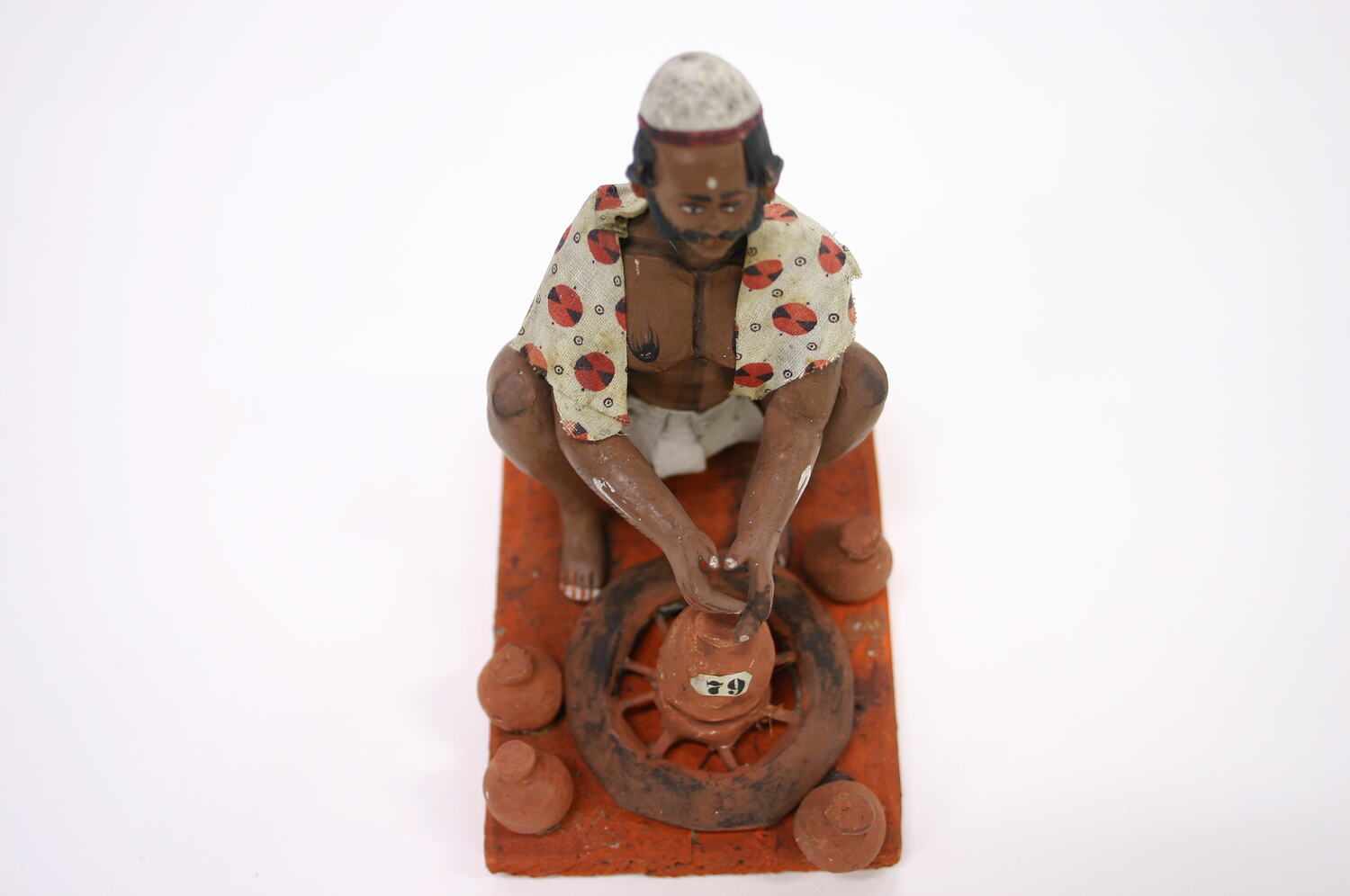 Figure of a man on a wooden base, painted orange. A paper label is glued to the base. The figure is plaster/composition modeled over wooden dowels, it is painted with a dark brown skin tone and is dressed in fabric. His garments consist of a white cotton shawl with red and brown circle decoration. He has a painted white skull cap and loincloth. He has a painted dark brown beard and moustache. He is seated in front of a potters spoke wheel and there are several thrown pots around him.
