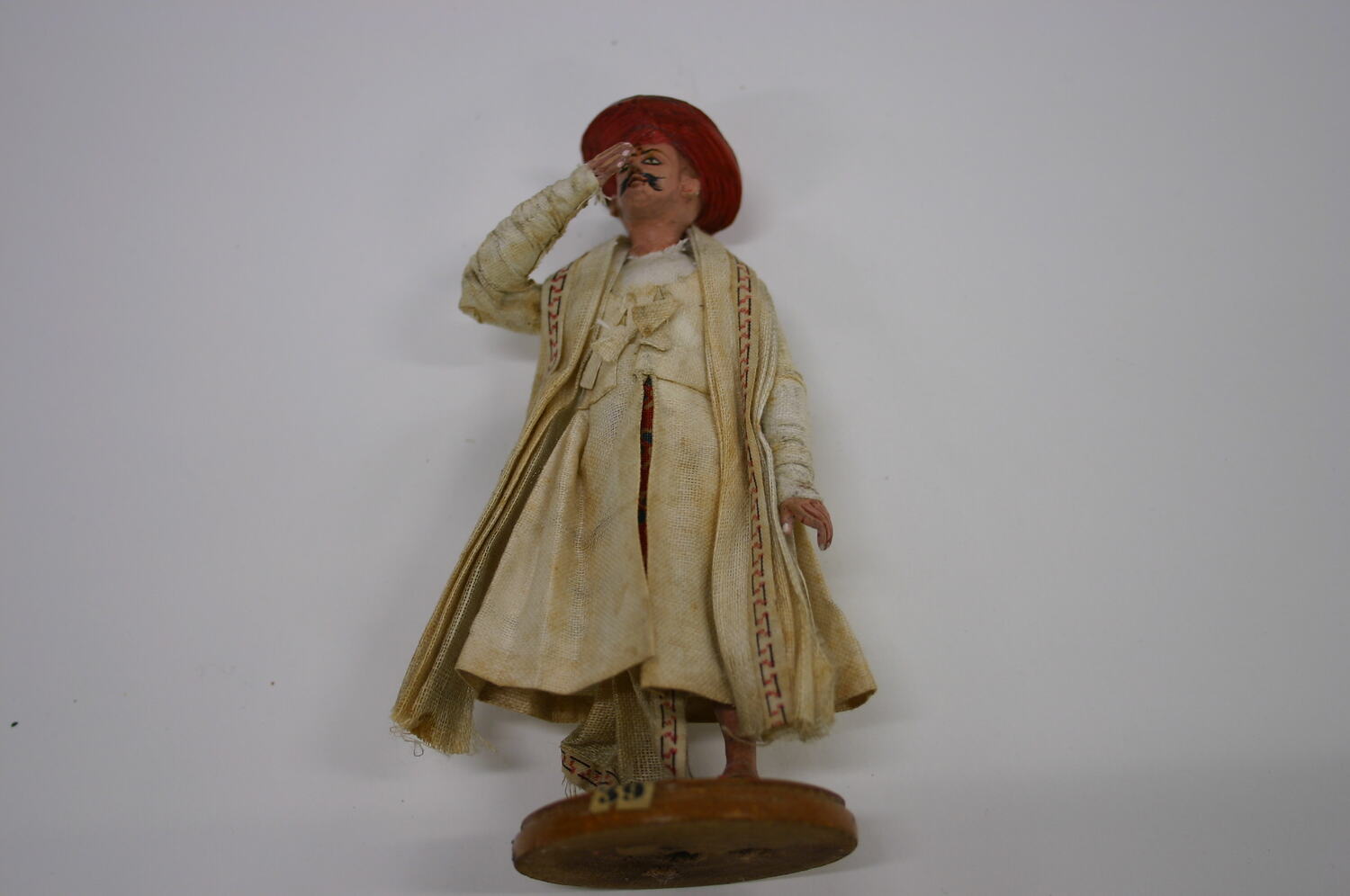 Figure of a man on a wooden base. The base is painted brown turned wood. A paper label is glued to the base. The figure is plaster/composition modeled over wooden dowels, it is painted with a terracotta skin tone and is dressed in fabric. His garments consist of white shirt, coat and trousers, all with red and black trim, and painted red shoes and a hat.