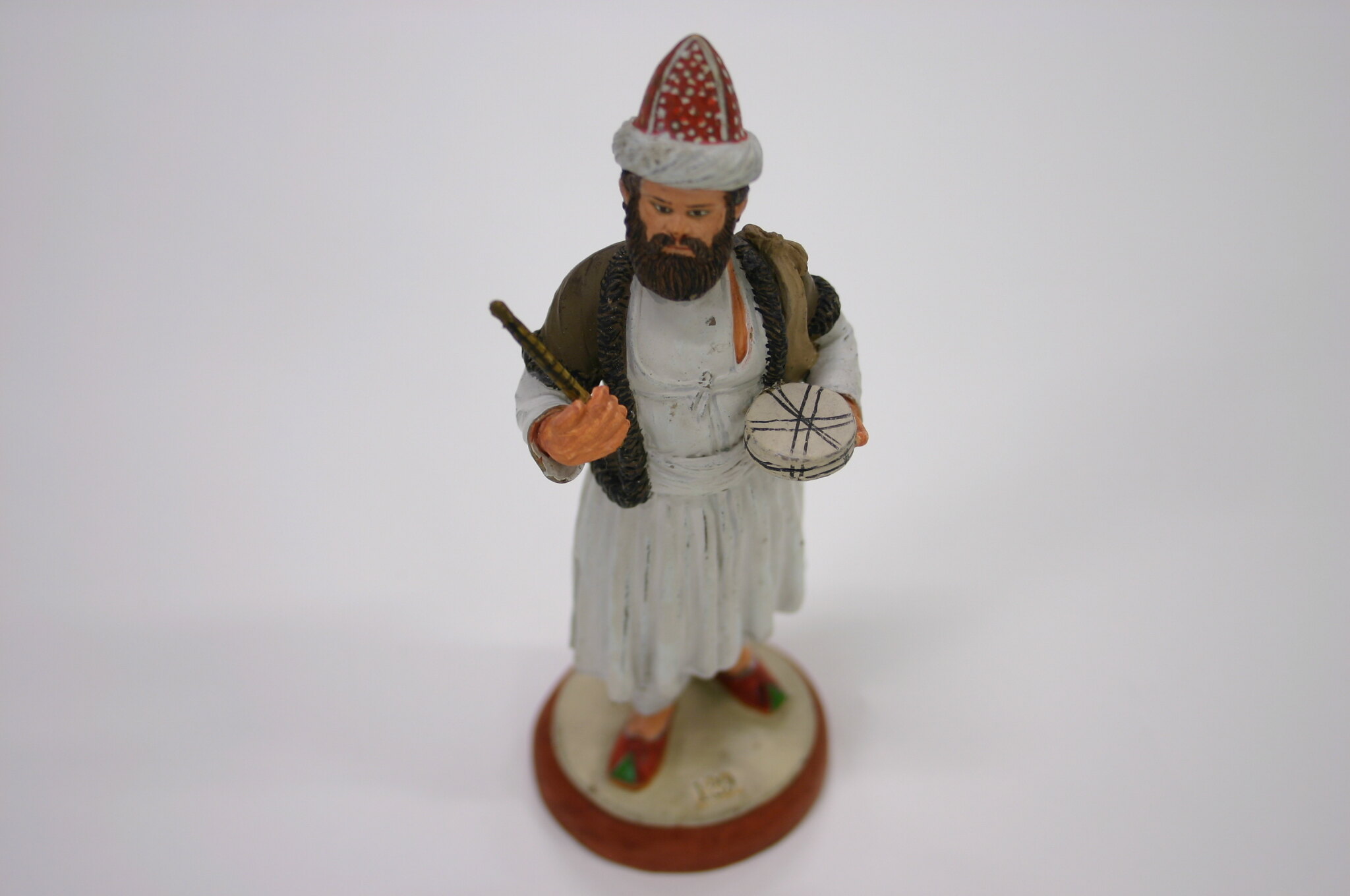 Figure of a man on a round base made from fired clay, painted brown. A paper label is glued to the base. The man is fired clay modeled over ferrous metal armature, which attaches to the base. The figure is painted with a terracotta skin tone and is wearing a pointed red hat with white polka dots, a white tunic, with a black wrap over his shoulders, and red shoes. He is holding a drum in his left hand and a stick in his right and has a brown bag over his left shoulder.
