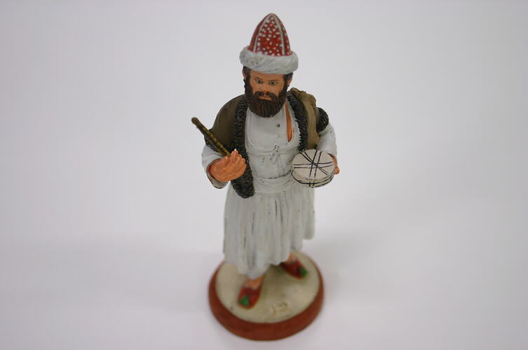 This clay figure of a Man holding a Drum was made in Lucknow, India. It was exhibited at the Melbourne International Exhibition in 1880, as part of a group of figures representing various castes, occupations and religious sects in India. This group was awarded a Third Order of Merit and was exhibited as part of the British India Court. It was gifted to the National Gallery of Victoria (NGV) by the India Commission of the Melbourne International Exhibition, 1880-81. The NGV Stock book number identifies this figure as a 'C...wlee Grape Seller', which is obviously inaccurate.
